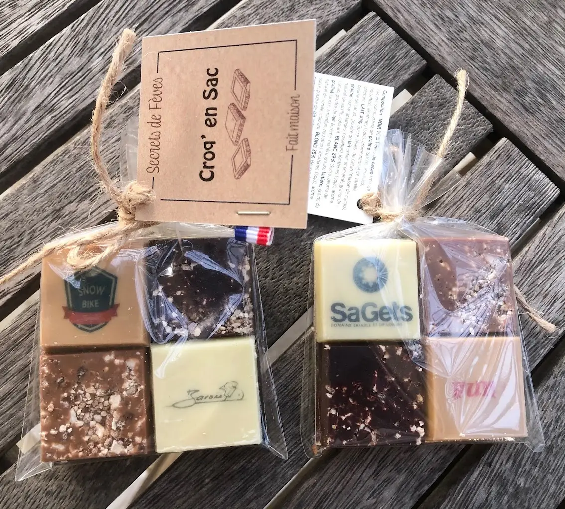 4 carrés maximum selon la demande. Chocolat personnalisable : blanc, blond et lait.